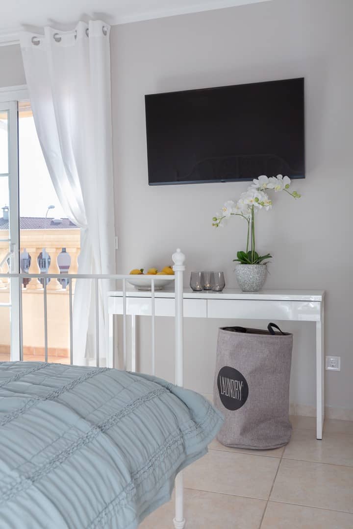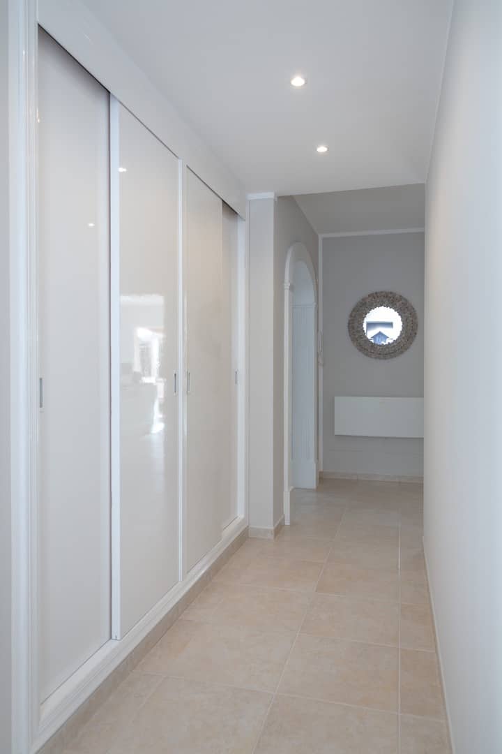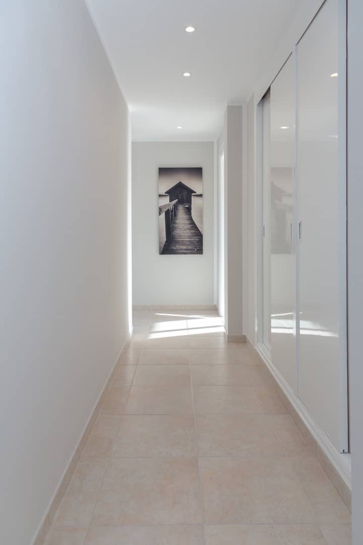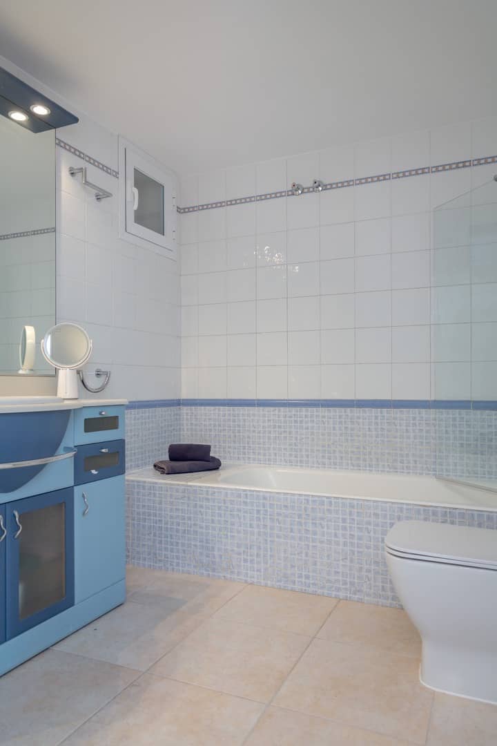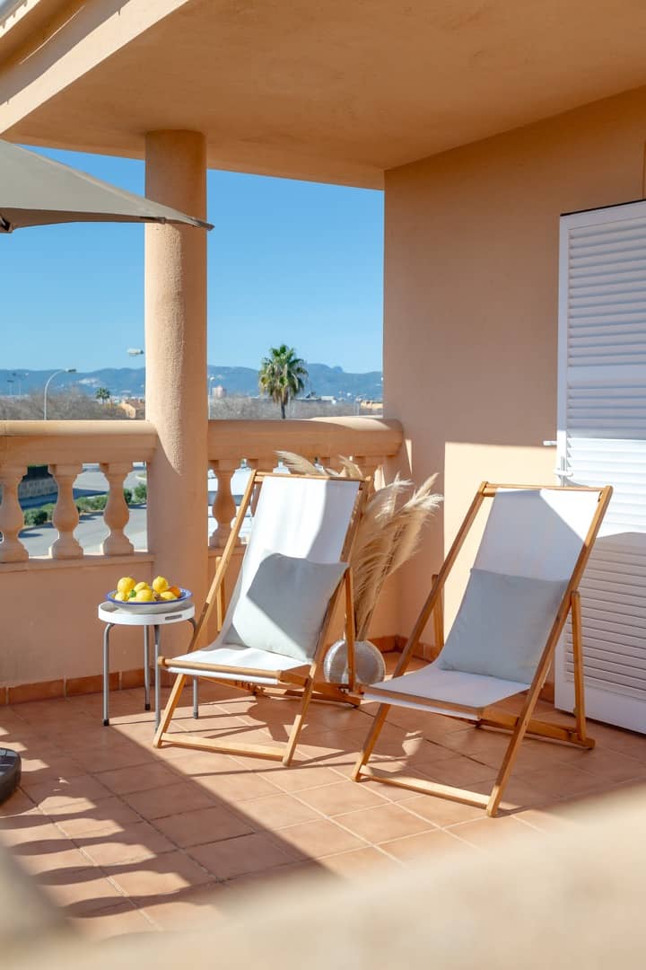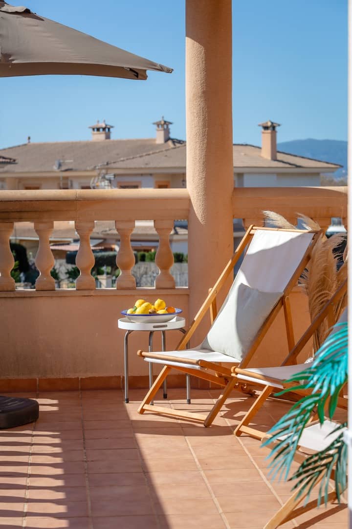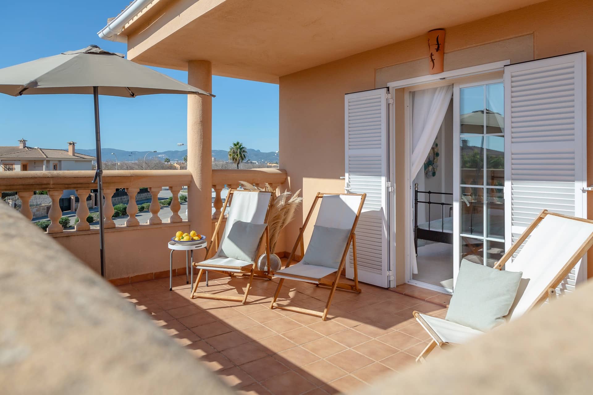 Im Obergeschoss gibt es 3 helle und luftige Schlafzimmer, jeweils mit 160×200 cm Doppelbett und großem Einbauschrank. Jedes Zimmer hat seinen eigenen Ausgang auf den Balkon bzw. die Süd-Terrasse, von wo man einen direkten Blick auf das ca. 15 Minuten entfernte Tramuntana-Gebirge genießen kann. Eines der Zimmer verfügt über ein Ensuite-Tageslichtbad mit Dusche/Badewanne, Waschtisch und WC. Ein weiteres großzügiges Tageslichtbad mit Doppelwaschtisch, Dusche/Badewanne und WC befindet sich gegenüber der Zimmer.