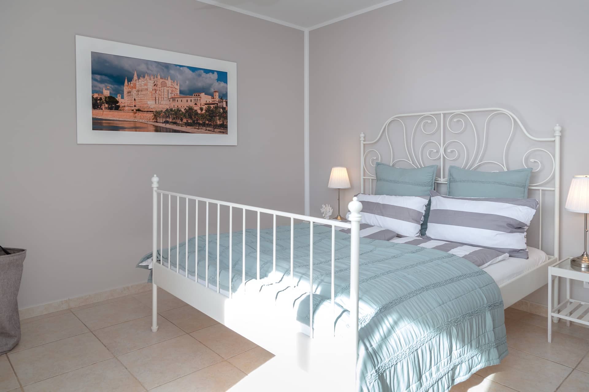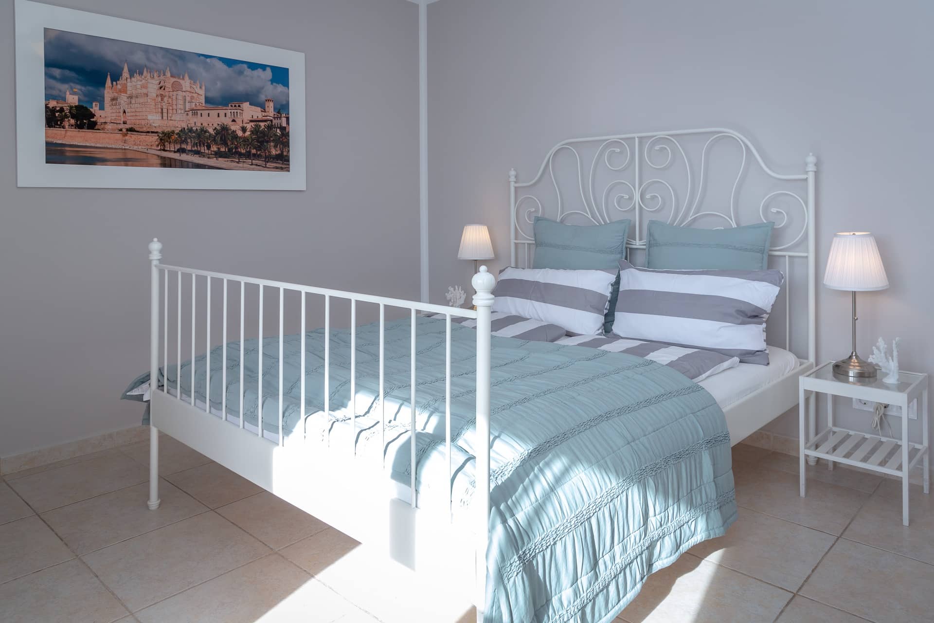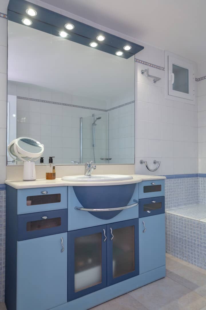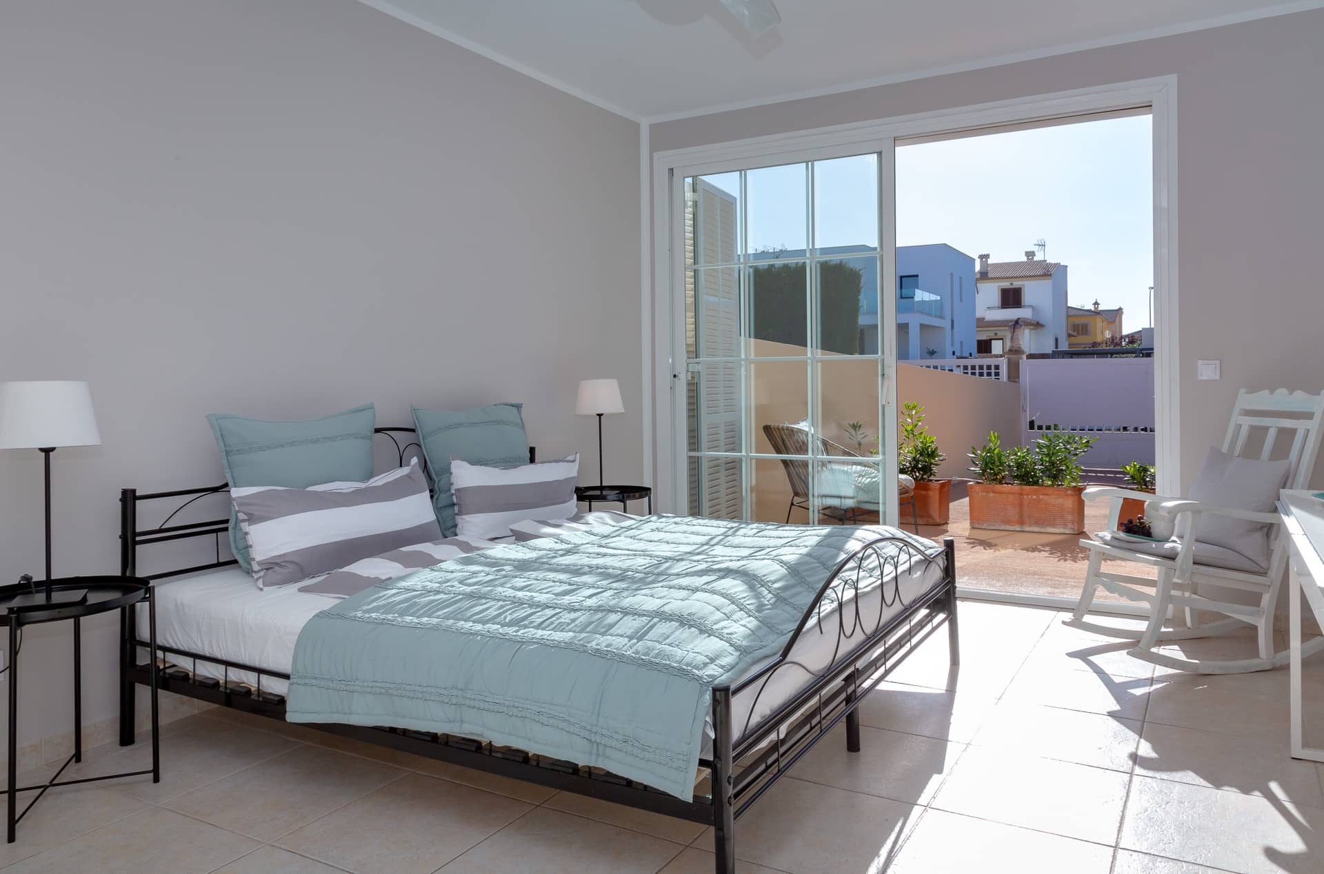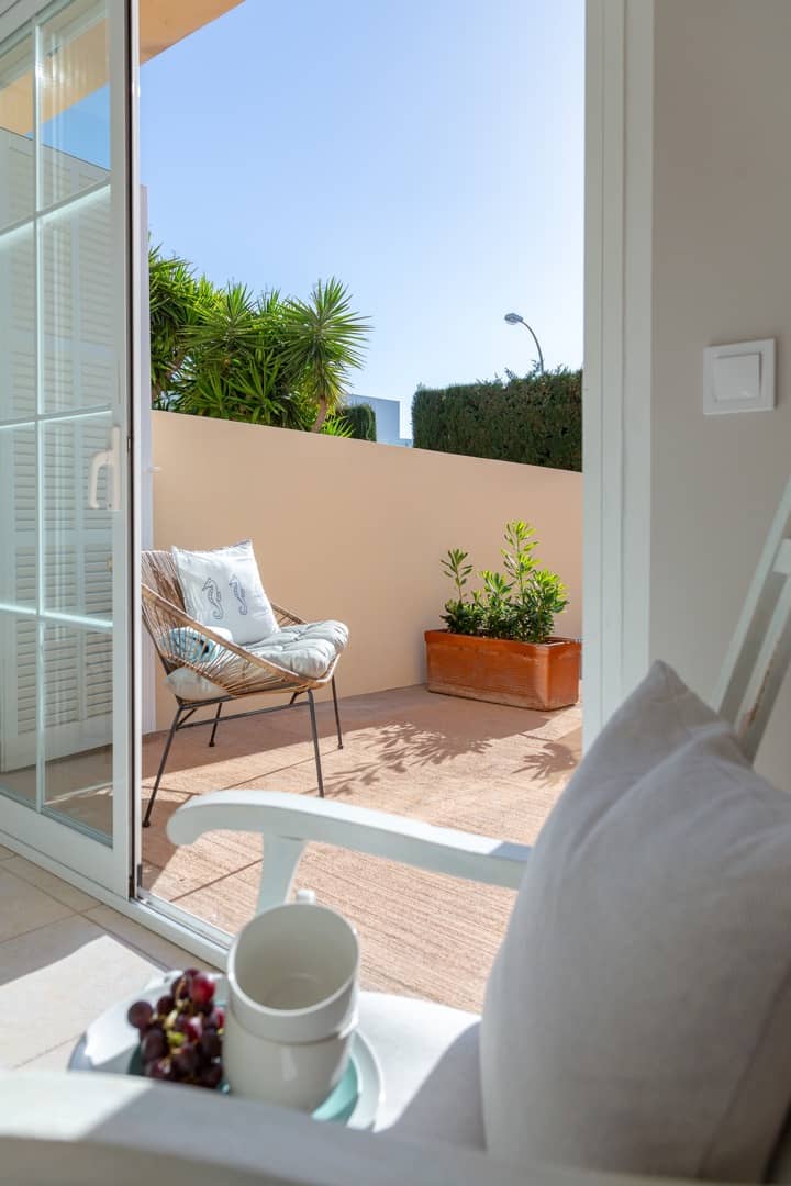 Im Obergeschoss gibt es 3 helle und luftige Schlafzimmer, jeweils mit 160×200 cm Doppelbett und großem Einbauschrank. Jedes Zimmer hat seinen eigenen Ausgang auf den Balkon bzw. die Süd-Terrasse, von wo man einen direkten Blick auf das ca. 15 Minuten entfernte Tramuntana-Gebirge genießen kann. Eines der Zimmer verfügt über ein Ensuite-Tageslichtbad mit Dusche/Badewanne, Waschtisch und WC. Ein weiteres großzügiges Tageslichtbad mit Doppelwaschtisch, Dusche/Badewanne und WC befindet sich gegenüber der Zimmer.
