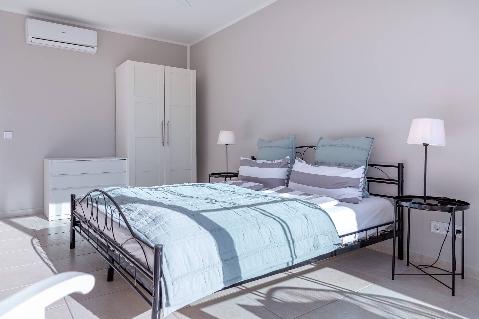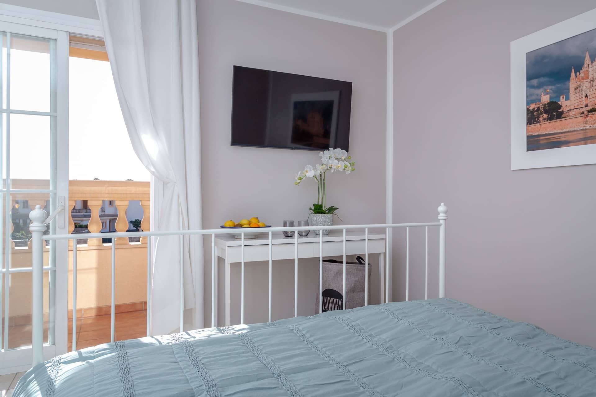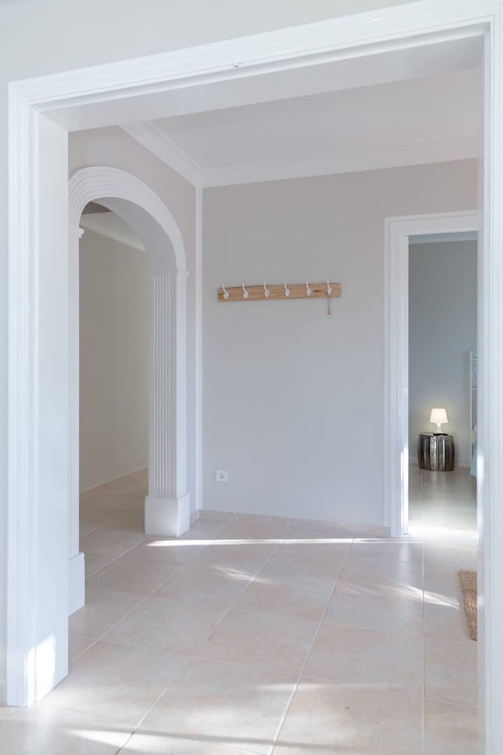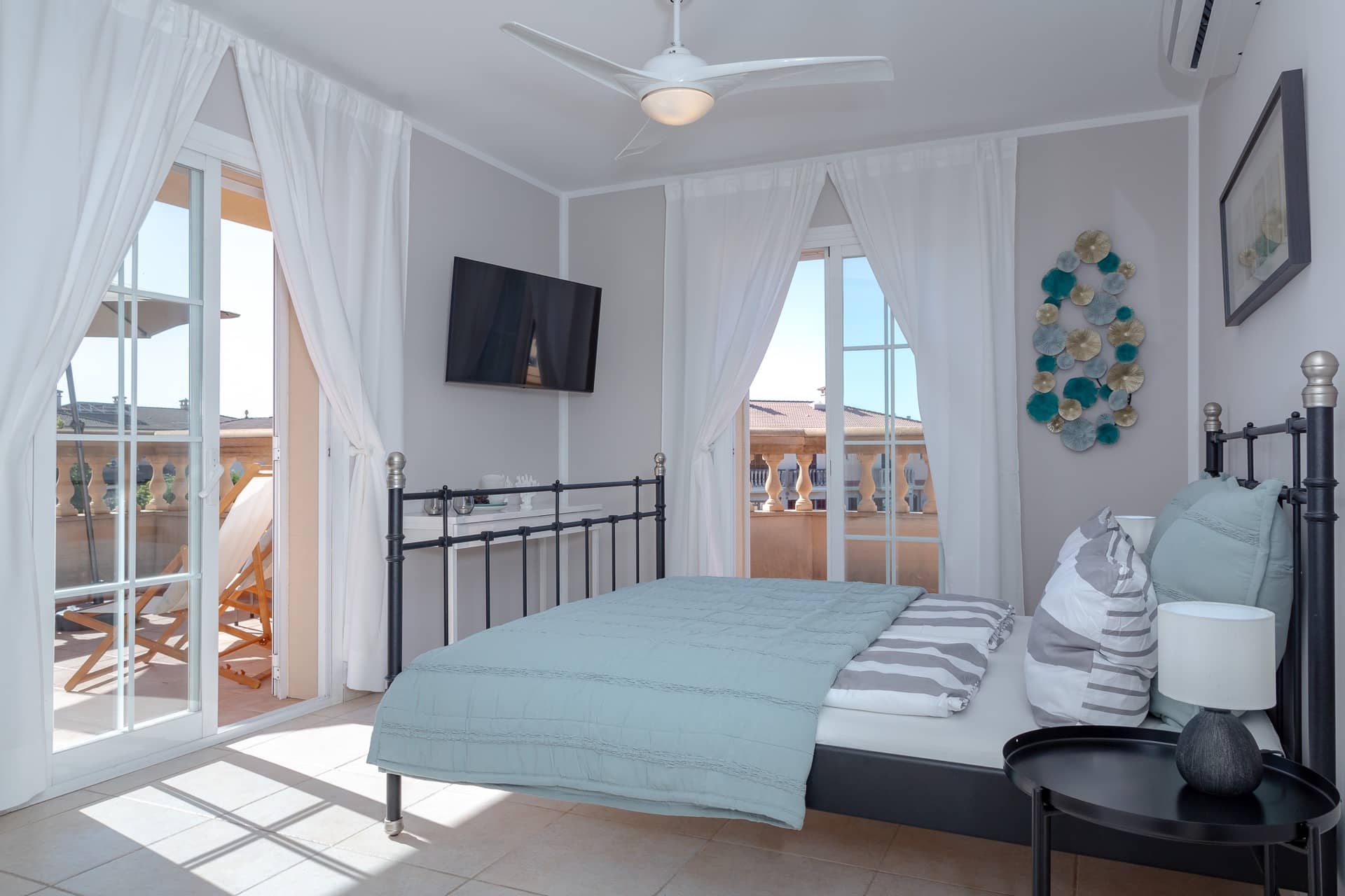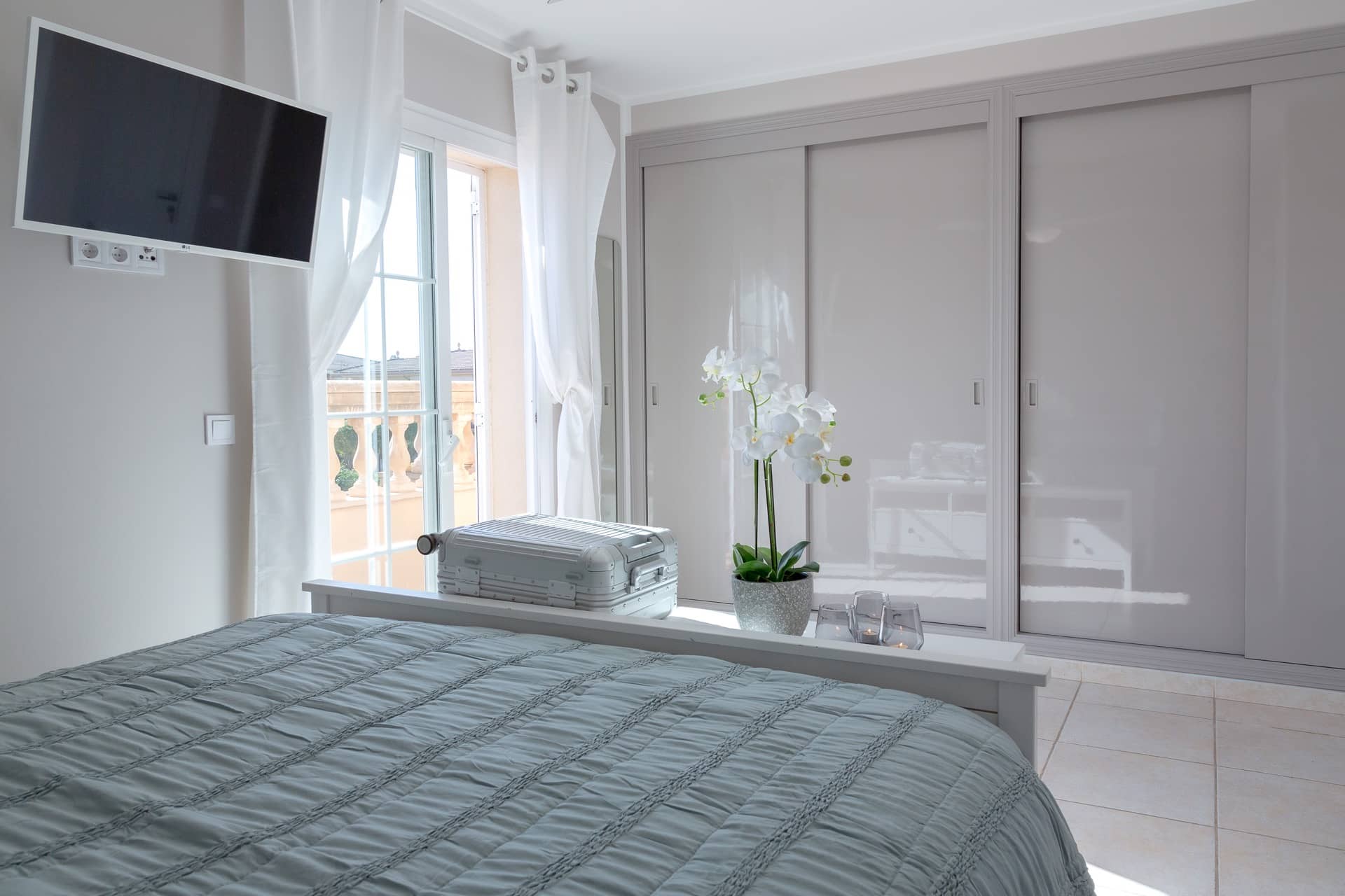 Im Obergeschoss gibt es 3 helle und luftige Schlafzimmer, jeweils mit 160×200 cm Doppelbett und großem Einbauschrank. Jedes Zimmer hat seinen eigenen Ausgang auf den Balkon bzw. die Süd-Terrasse, von wo man einen direkten Blick auf das ca. 15 Minuten entfernte Tramuntana-Gebirge genießen kann. Eines der Zimmer verfügt über ein Ensuite-Tageslichtbad mit Dusche/Badewanne, Waschtisch und WC. Ein weiteres großzügiges Tageslichtbad mit Doppelwaschtisch, Dusche/Badewanne und WC befindet sich gegenüber der Zimmer.