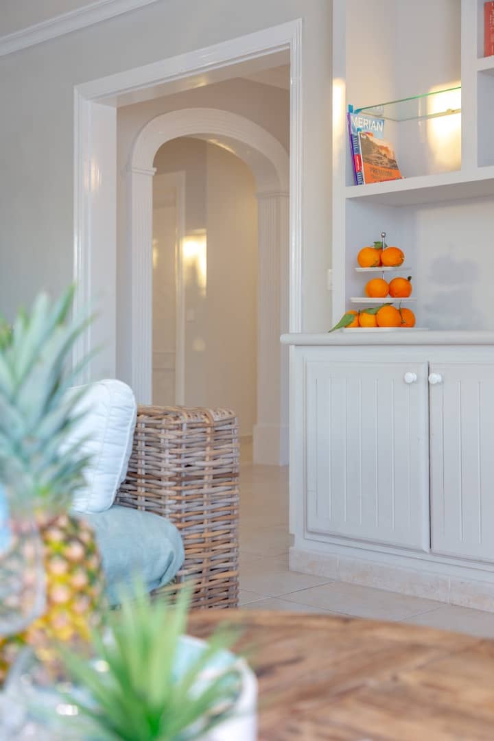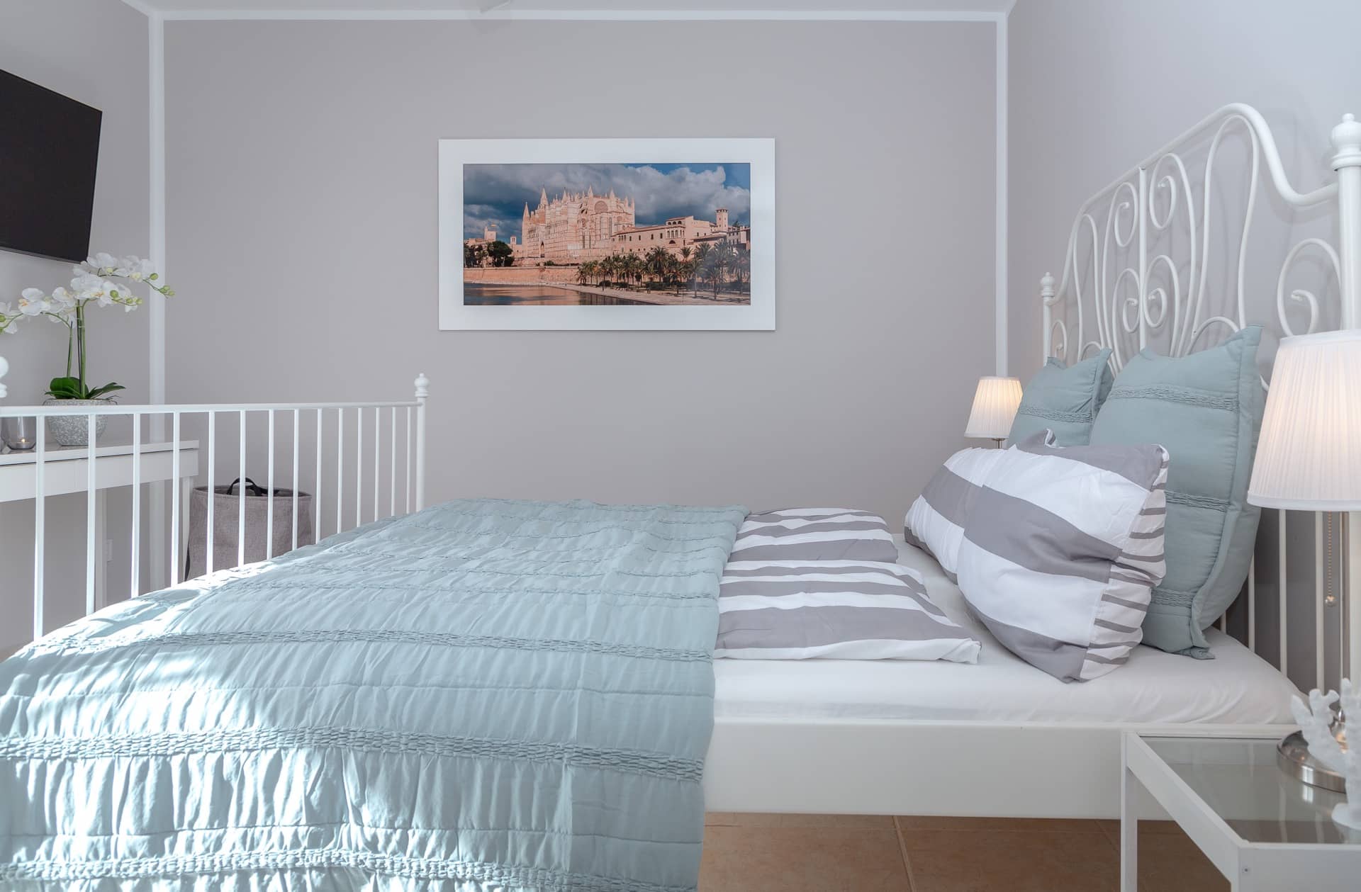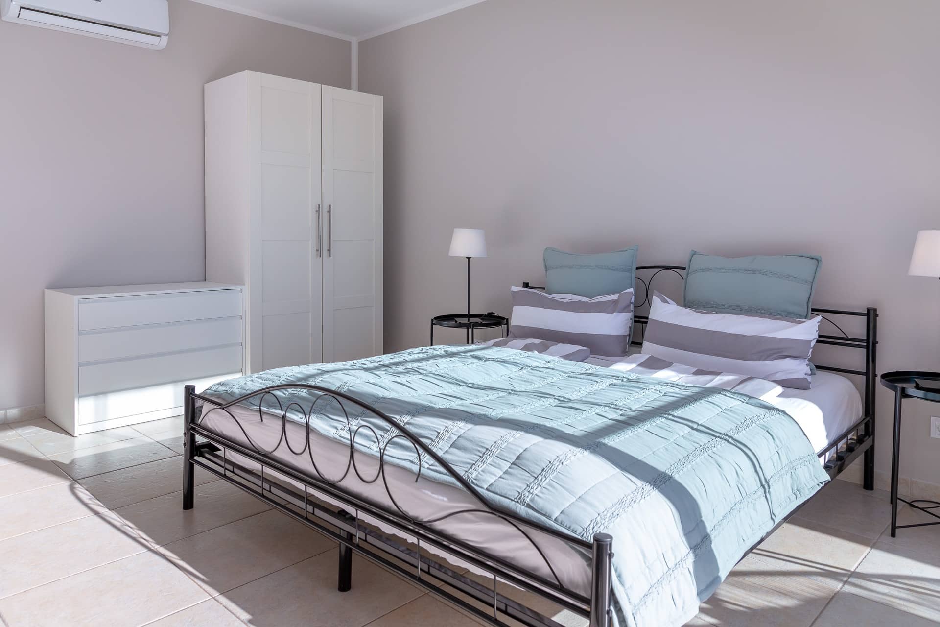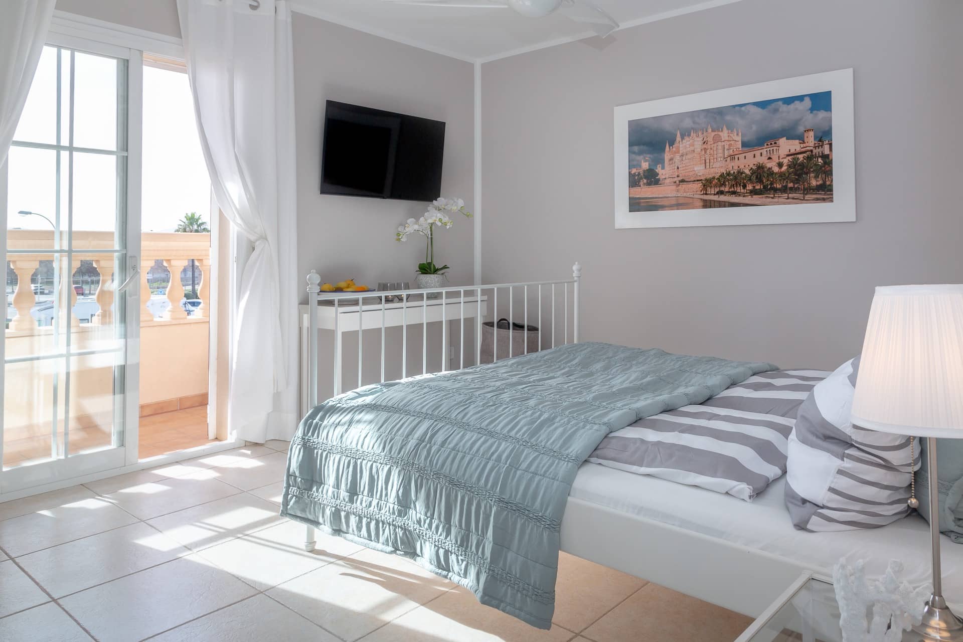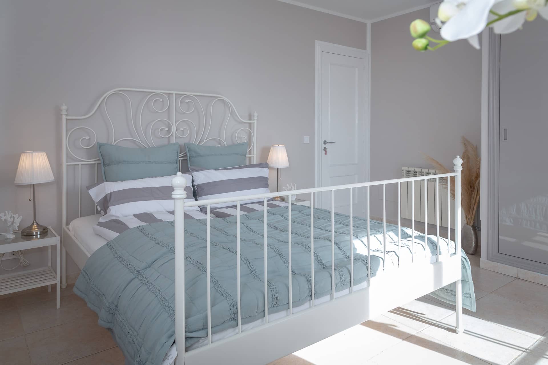 Im Obergeschoss gibt es 3 helle und luftige Schlafzimmer, jeweils mit 160×200 cm Doppelbett und großem Einbauschrank. Jedes Zimmer hat seinen eigenen Ausgang auf den Balkon bzw. die Süd-Terrasse, von wo man einen direkten Blick auf das ca. 15 Minuten entfernte Tramuntana-Gebirge genießen kann. Eines der Zimmer verfügt über ein Ensuite-Tageslichtbad mit Dusche/Badewanne, Waschtisch und WC. Ein weiteres großzügiges Tageslichtbad mit Doppelwaschtisch, Dusche/Badewanne und WC befindet sich gegenüber der Zimmer.
