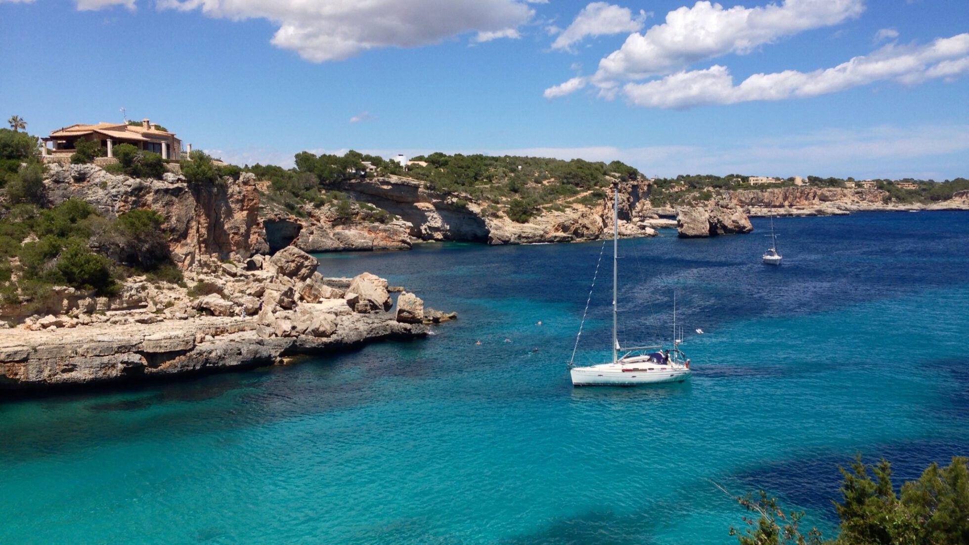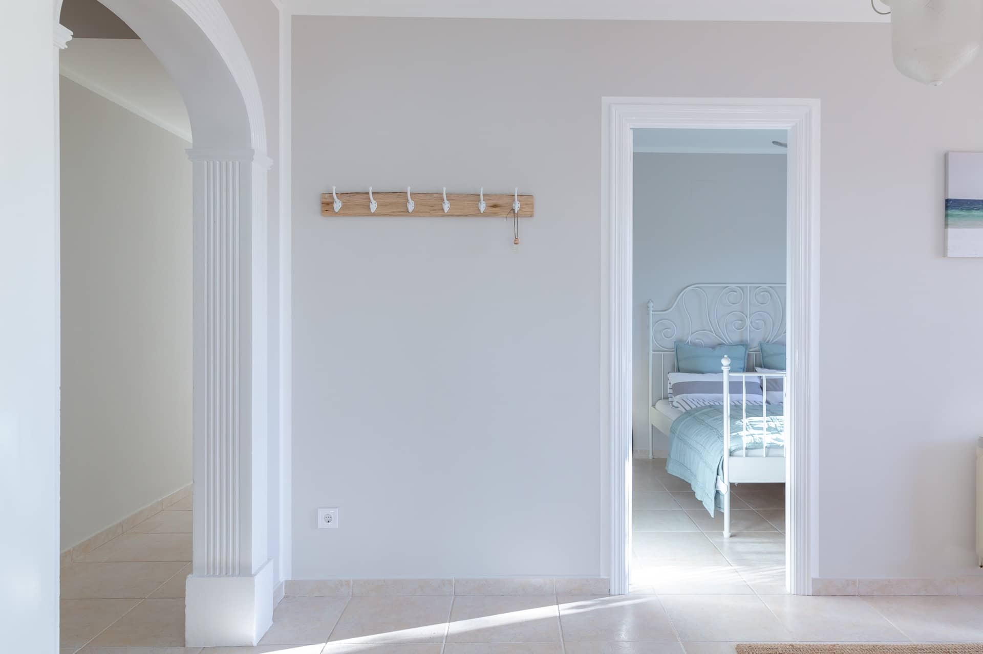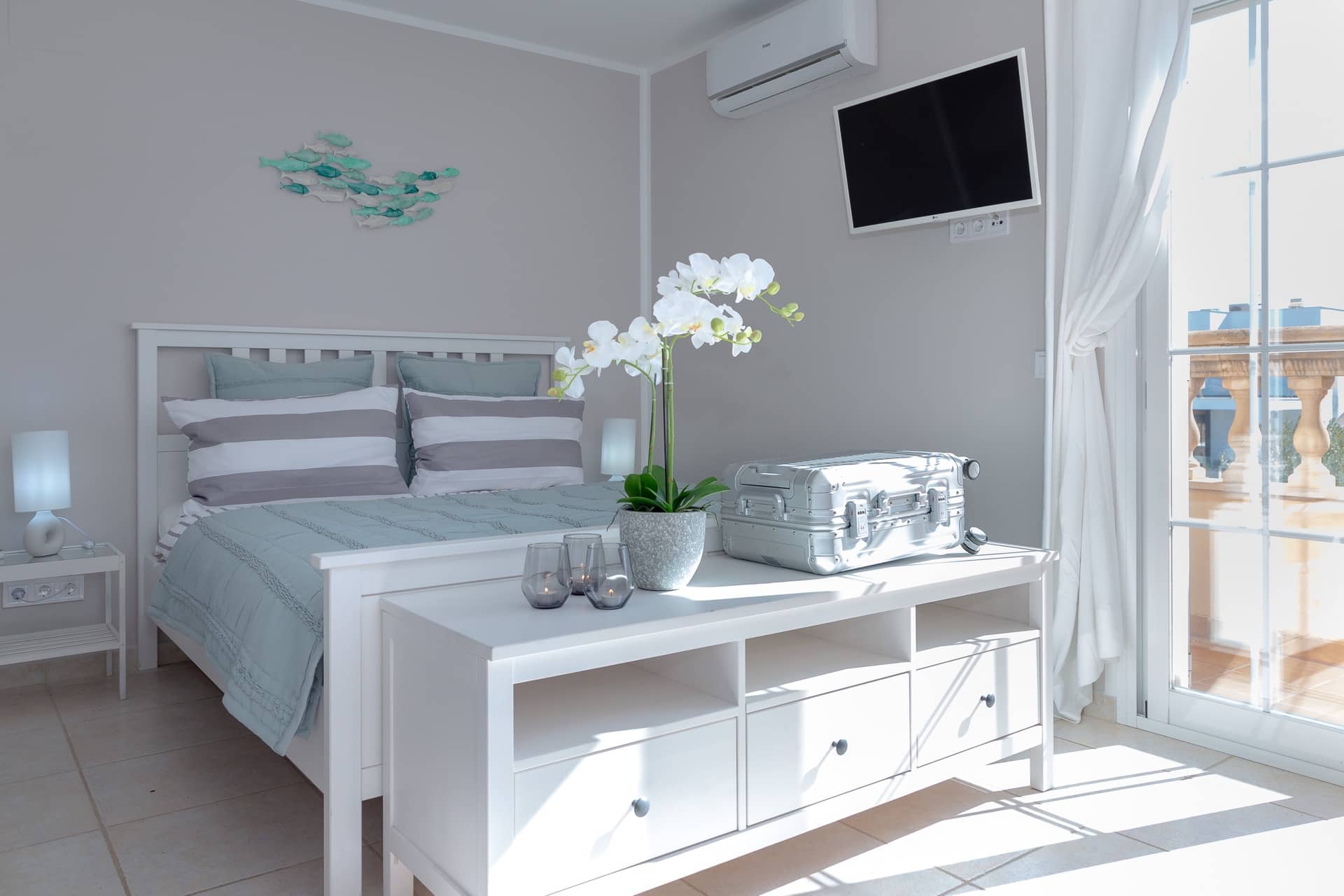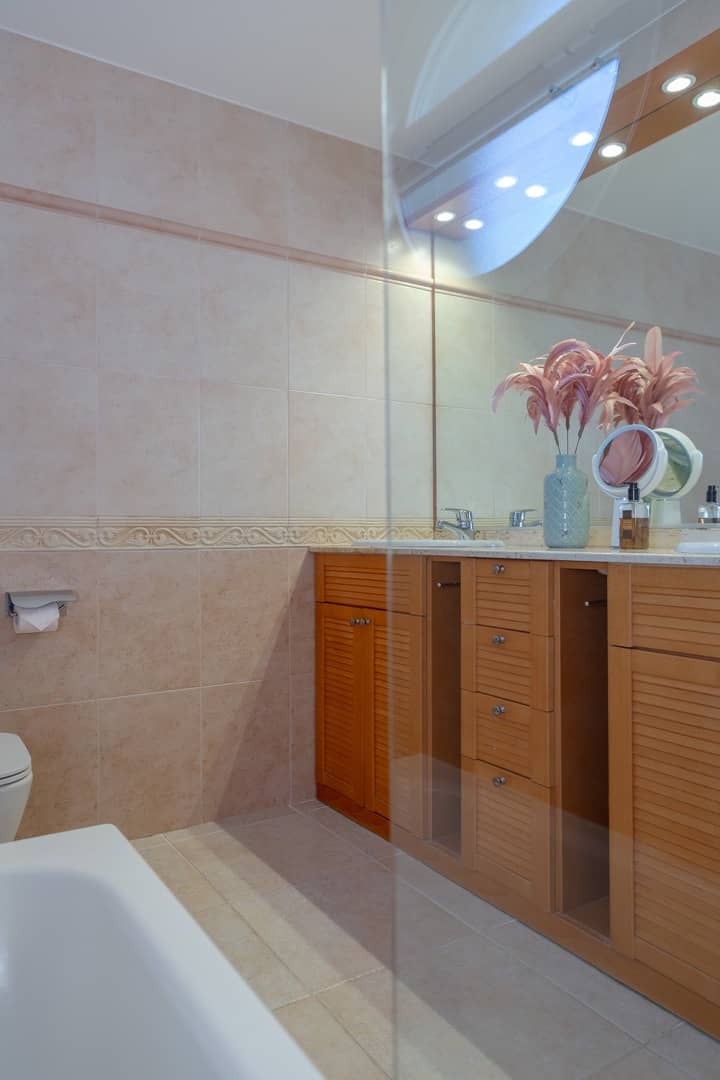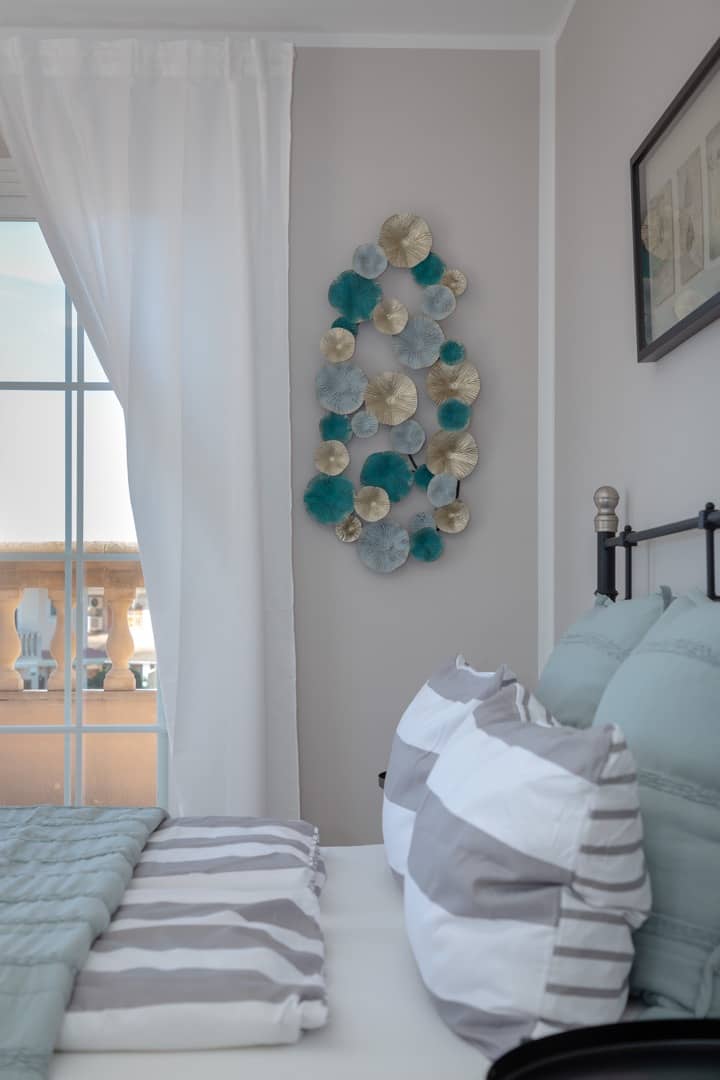 Im Obergeschoss gibt es 3 helle und luftige Schlafzimmer, jeweils mit 160×200 cm Doppelbett und großem Einbauschrank. Jedes Zimmer hat seinen eigenen Ausgang auf den Balkon bzw. die Süd-Terrasse, von wo man einen direkten Blick auf das ca. 15 Minuten entfernte Tramuntana-Gebirge genießen kann. Eines der Zimmer verfügt über ein Ensuite-Tageslichtbad mit Dusche/Badewanne, Waschtisch und WC. Ein weiteres großzügiges Tageslichtbad mit Doppelwaschtisch, Dusche/Badewanne und WC befindet sich gegenüber der Zimmer.