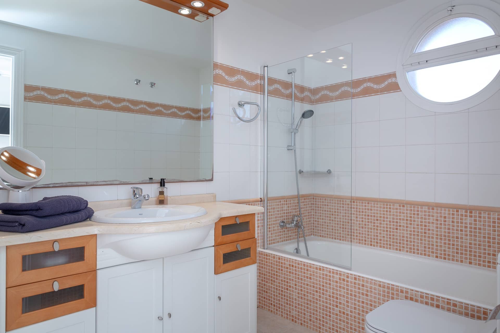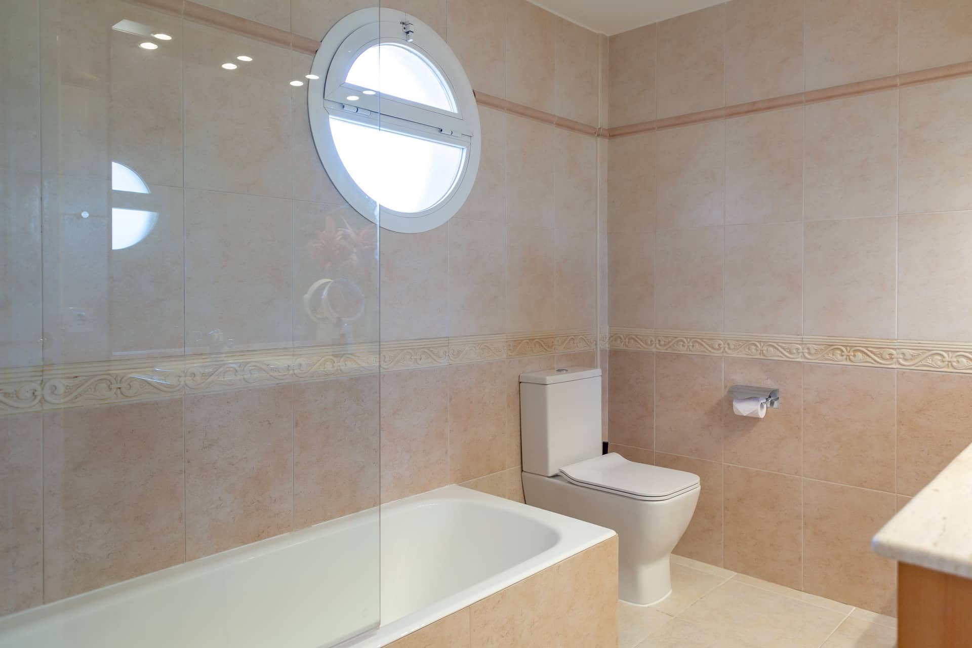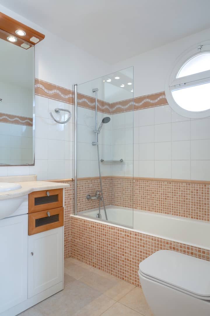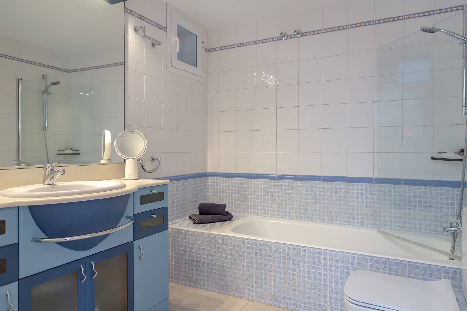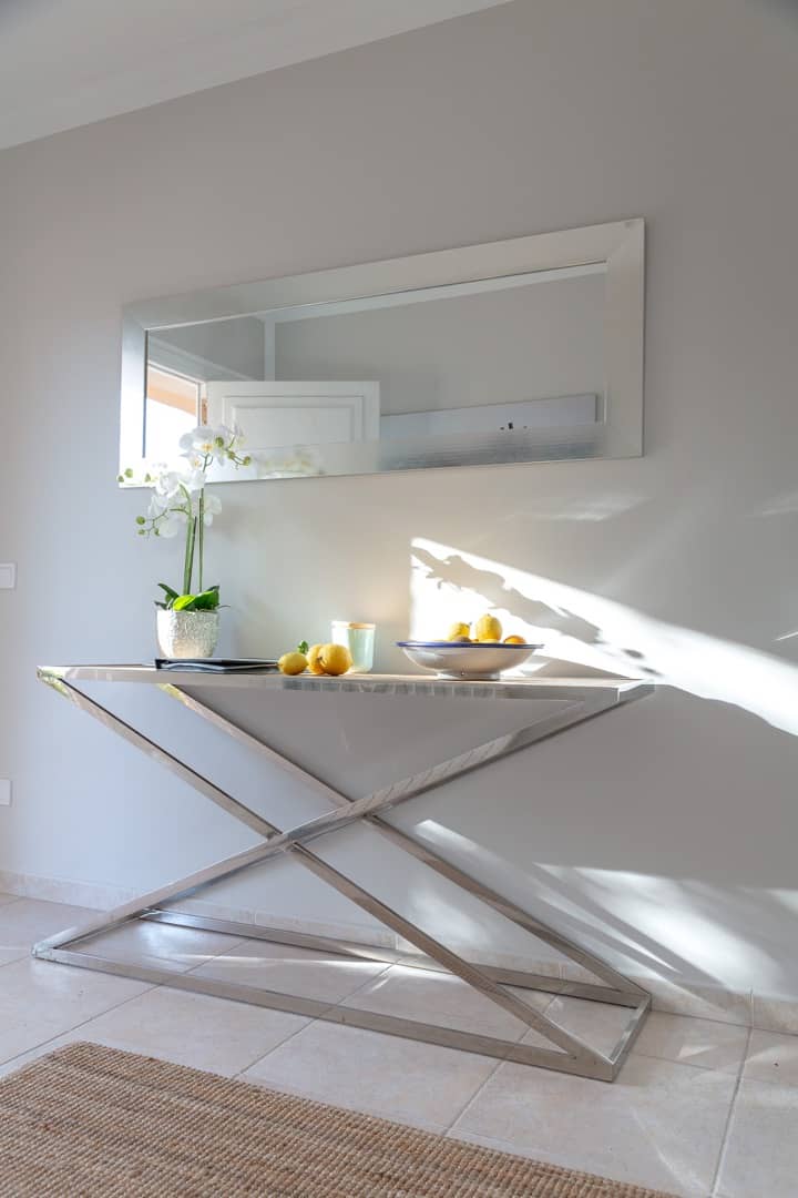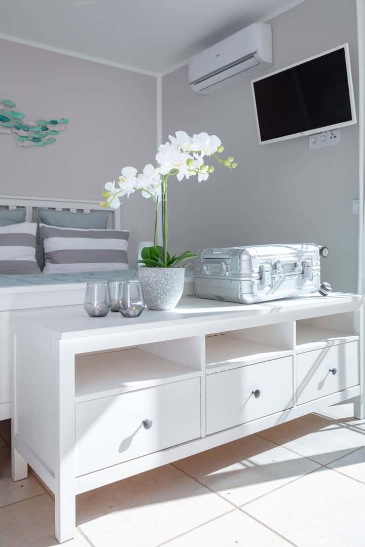 Im Obergeschoss gibt es 3 helle und luftige Schlafzimmer, jeweils mit 160×200 cm Doppelbett und großem Einbauschrank. Jedes Zimmer hat seinen eigenen Ausgang auf den Balkon bzw. die Süd-Terrasse, von wo man einen direkten Blick auf das ca. 15 Minuten entfernte Tramuntana-Gebirge genießen kann. Eines der Zimmer verfügt über ein Ensuite-Tageslichtbad mit Dusche/Badewanne, Waschtisch und WC. Ein weiteres großzügiges Tageslichtbad mit Doppelwaschtisch, Dusche/Badewanne und WC befindet sich gegenüber der Zimmer.