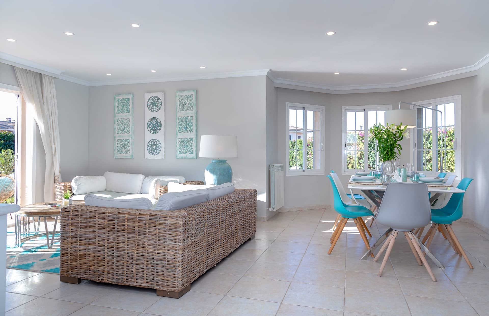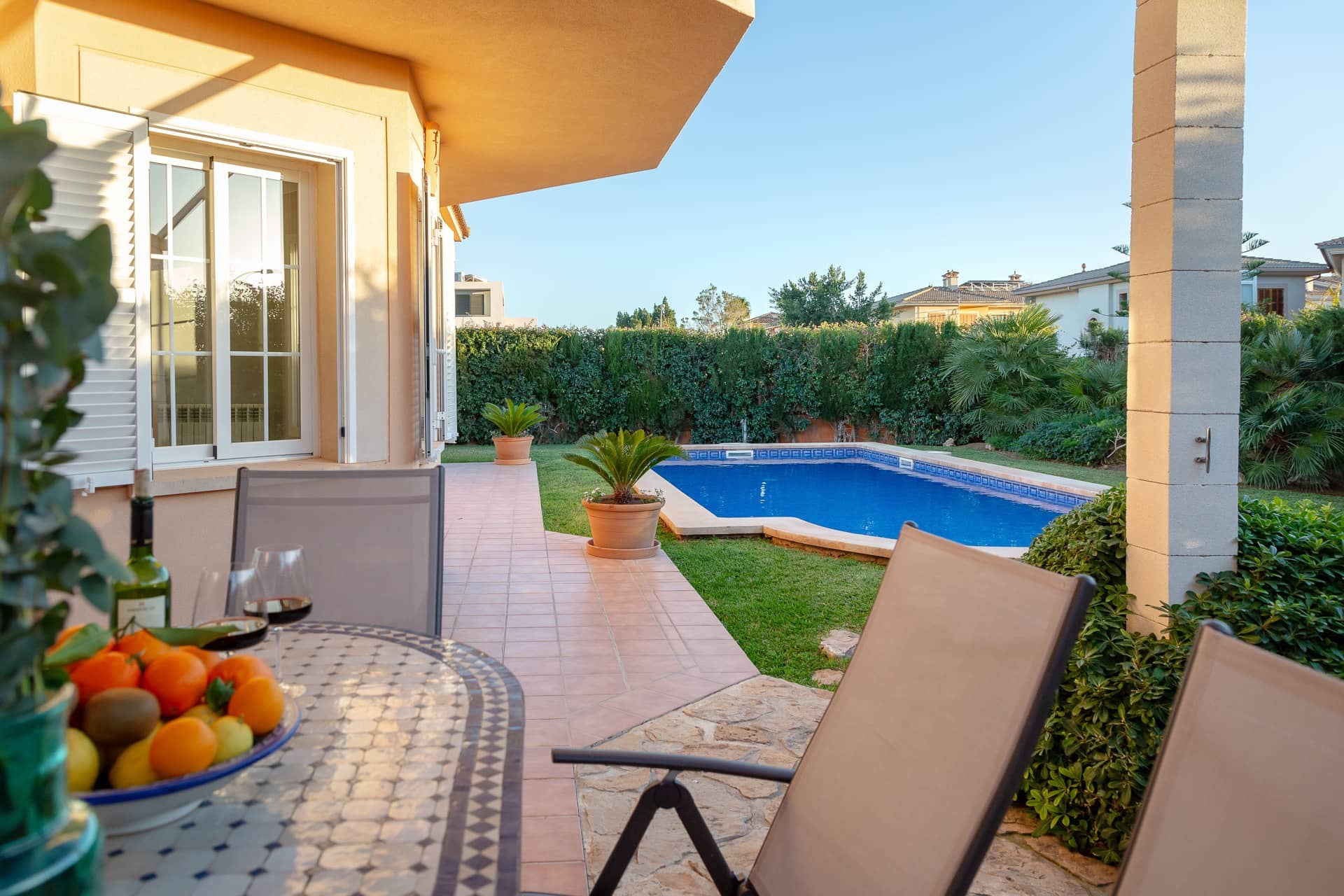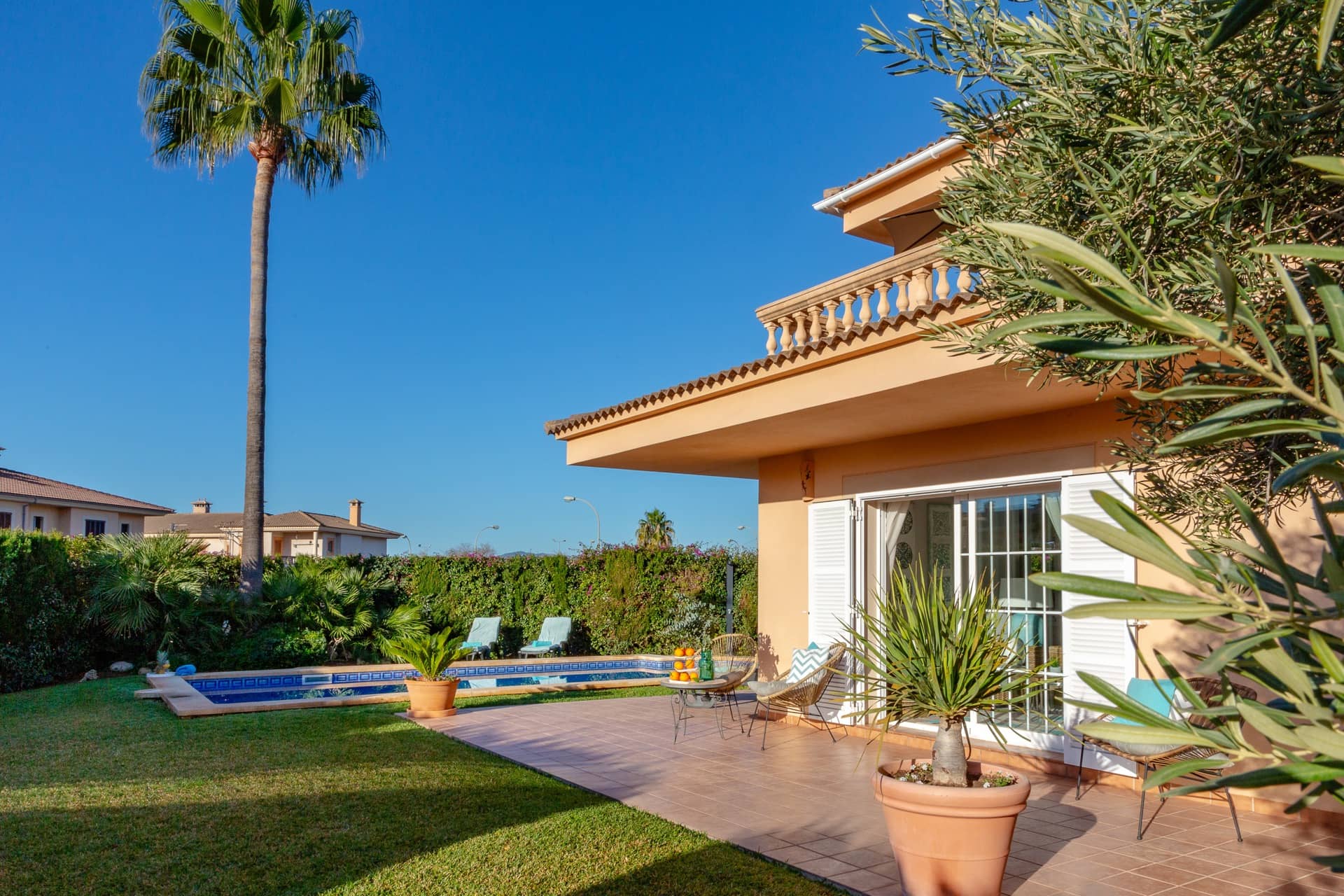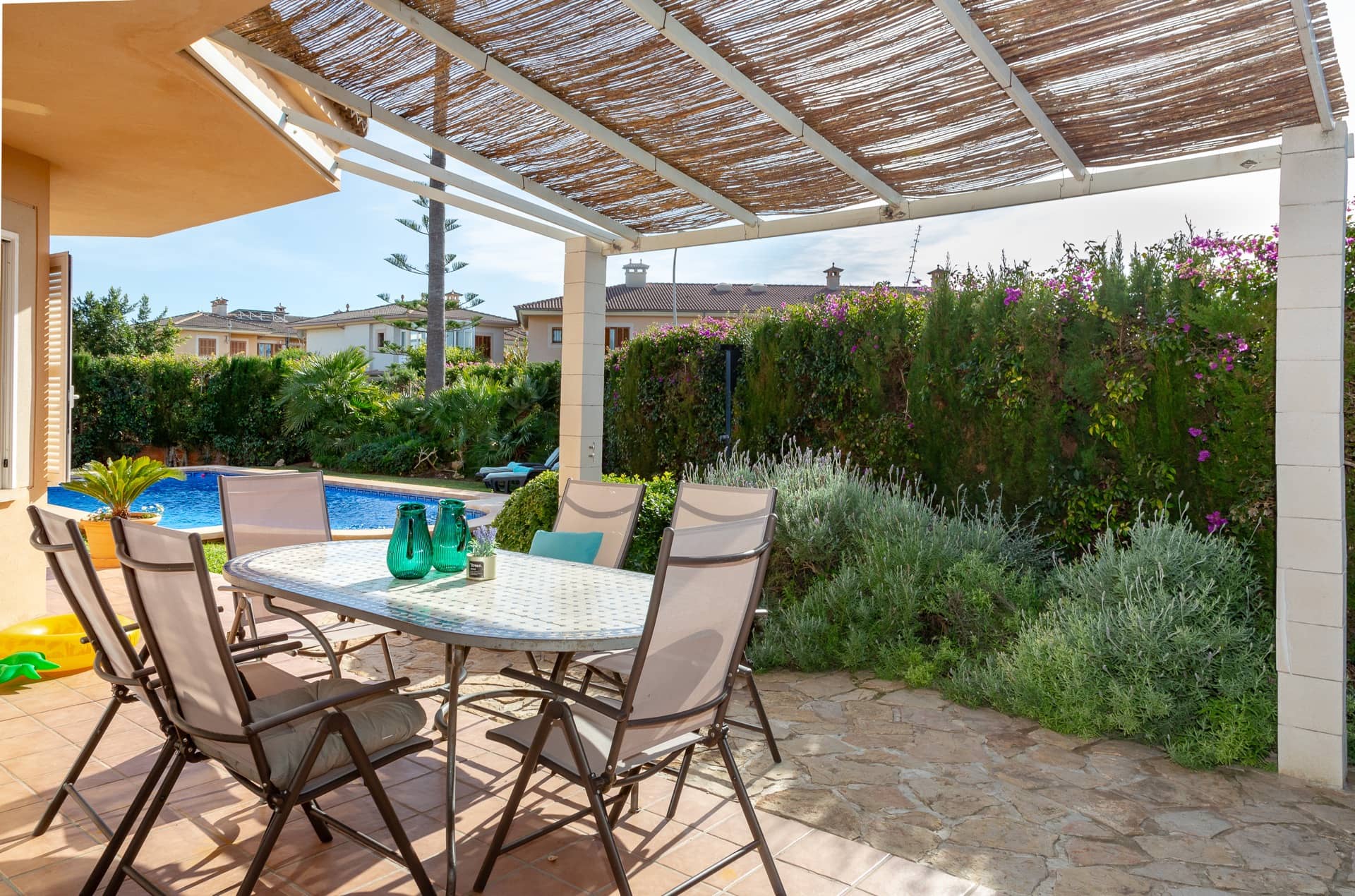 Im Süden Mallorcas, nur 10 Minuten vom internationalen Flughafen Palma entfernt, liegt unsere wunderschöne VILLA PALMERA in der Urbanisation Ses Cases Noves, in der Gemeinde Marratxí. Auf 250 m2 Wohnfläche lässt es sich komfortabel Urlaub machen: 4 Schlafzimmer (alle mit Klimaanlagen und zusätzlichen Ventilatoren), 3 Bäder, großes Wohn-Esszimmer, moderne Küche und ein großzügiger Pool im wundervollen Garten. Ein Traum für bis zu 8 Personen für eine unvergessliche Zeit!