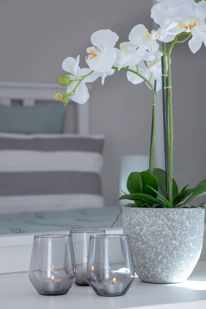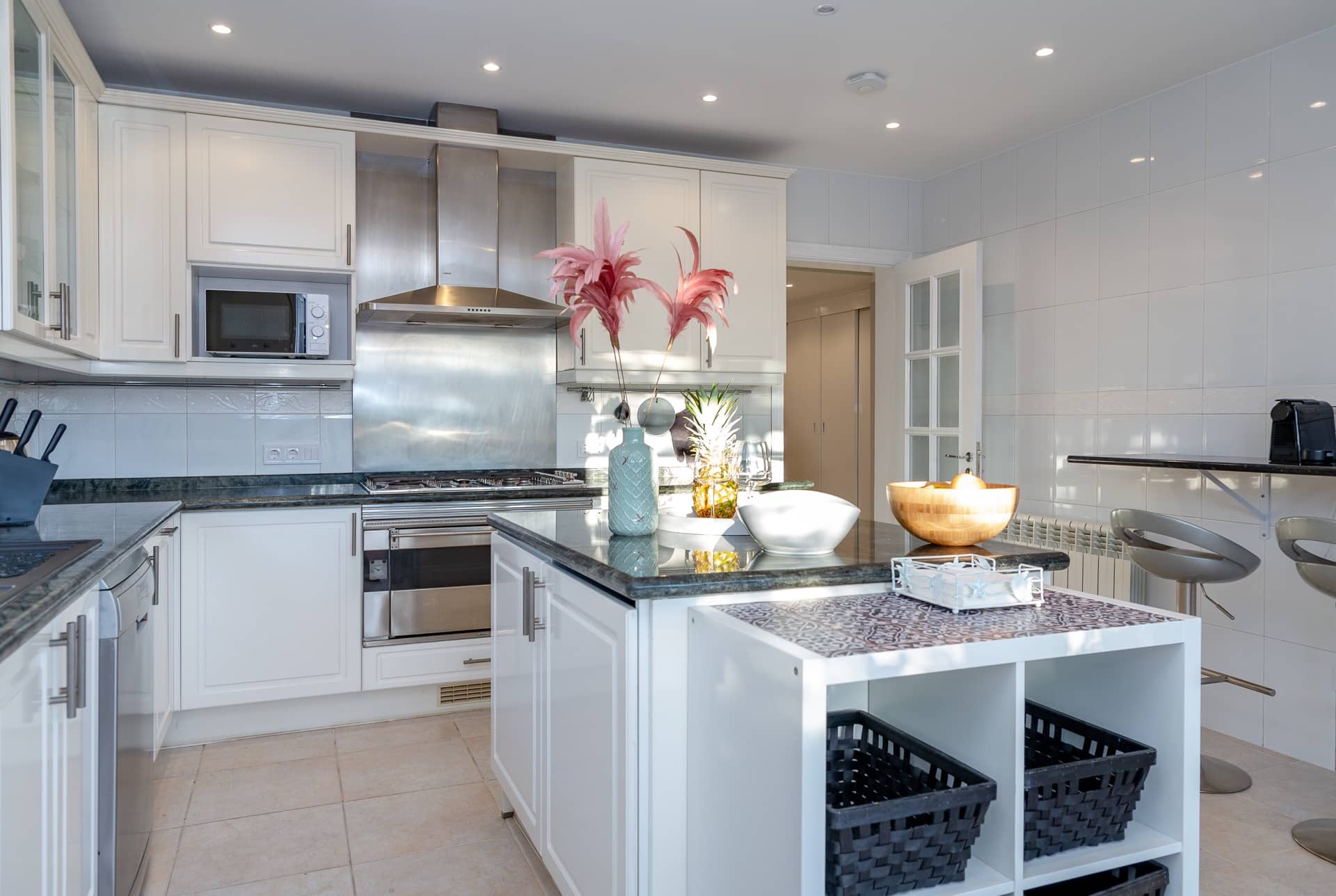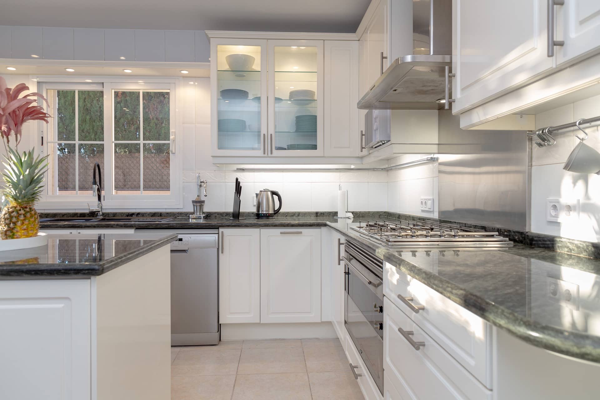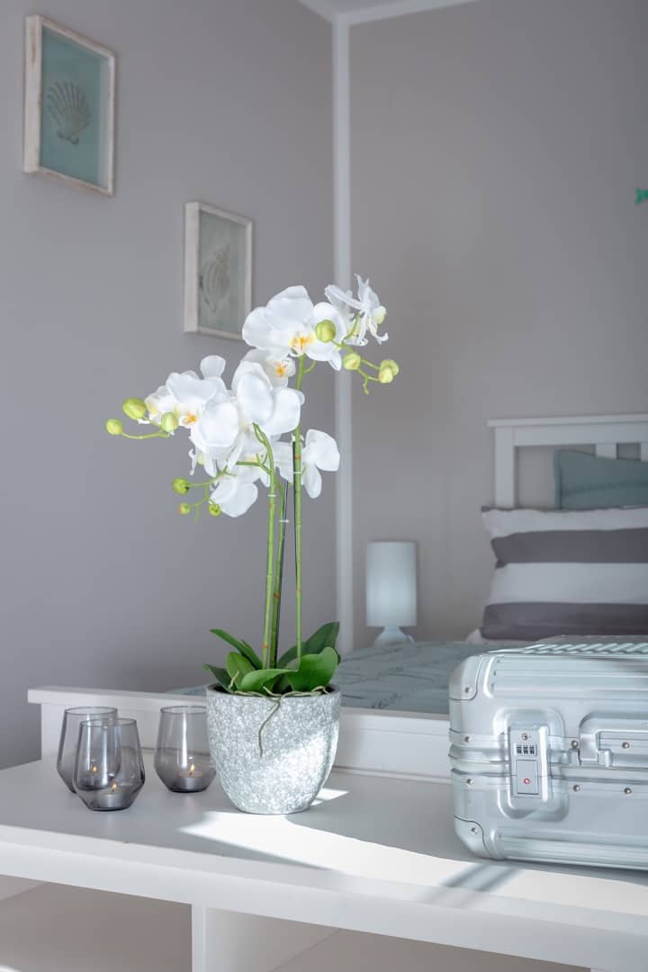 Im Erdgeschoss das großzügige Wohnzimmer mit Satelliten-TV, Essbereich, die moderne Küche (mit Gasherd, Backofen, Spülmaschine, Kühl-Gefrierschrank, Nespresso-Maschine, Toaster und kompletter Geschirrausstattung), ein Tageslichtbad mit Badewanne / Dusche, Waschtisch und WC sowie ein großes Schlafzimmer mit 160×200 cm Doppelbett.