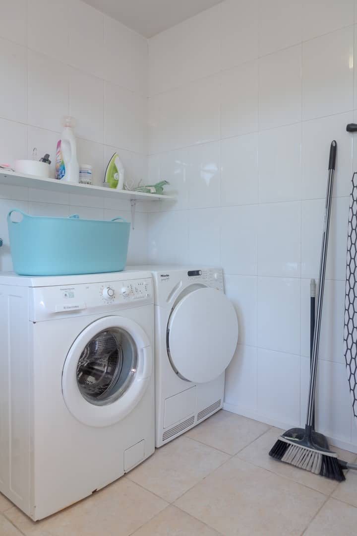 Vom Schlaf- und vom Wohnzimmer sowie der Küche hat man direkten Zugang zum Garten. Der Hauswirtschaftsraum mit Waschmaschine und Wäschetrockner und die Zentralheizung befinden sich ebenso im Erdgeschoss.